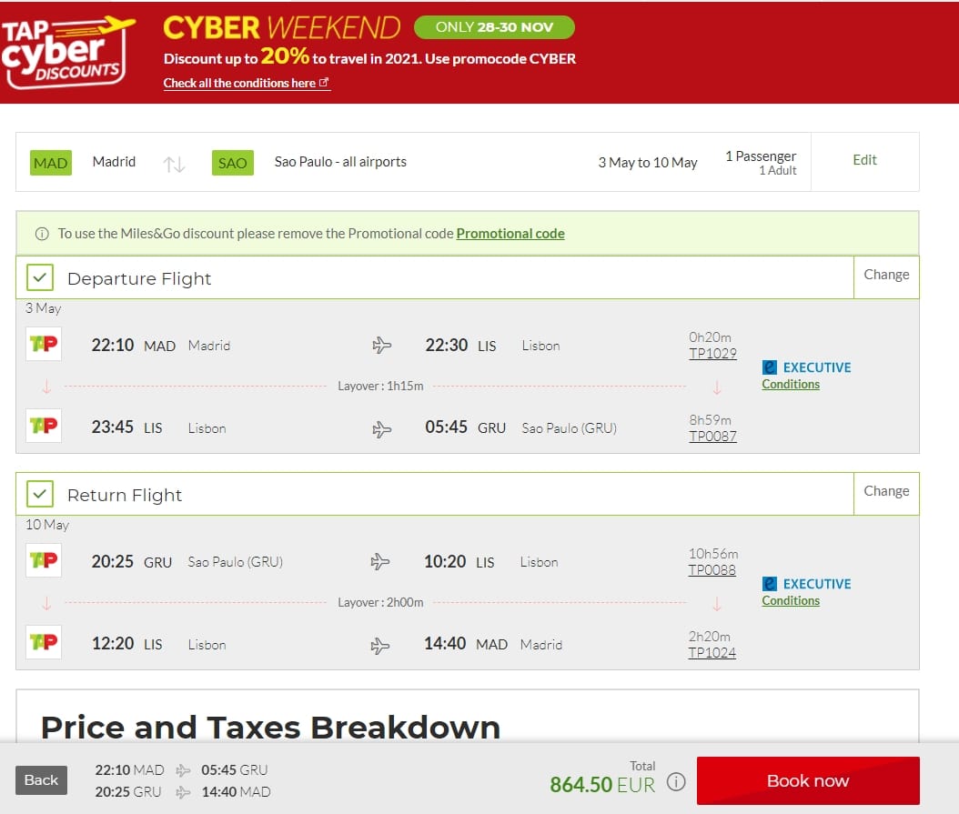 Select your flight and enter the promotion code CYBER by checking the box “I have a promotion or congress code”