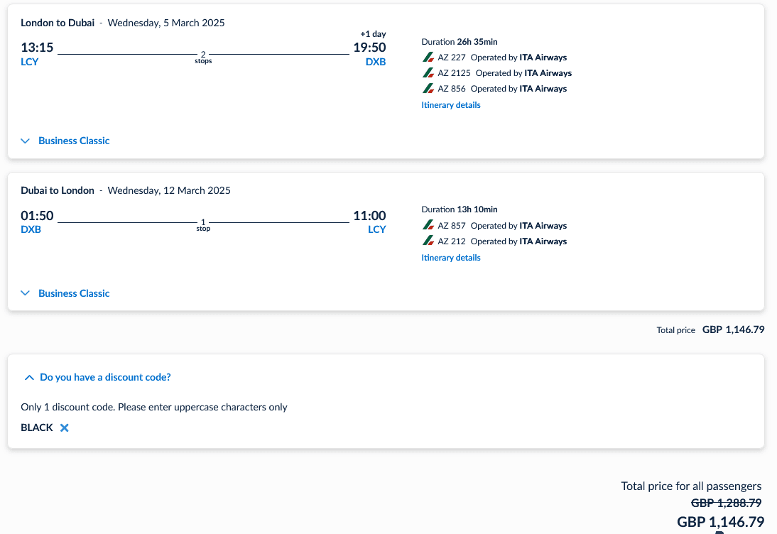 ITA Airways has started their Black Friday Sale today, with a discount code you get 20% off on all flights in Business Class and other classes.