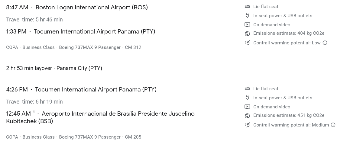 With Copa Airlines, lie flat seats possible all the way with flights operated by the 737-9 Max. A stopover in Panama City for a few days is possible as well.