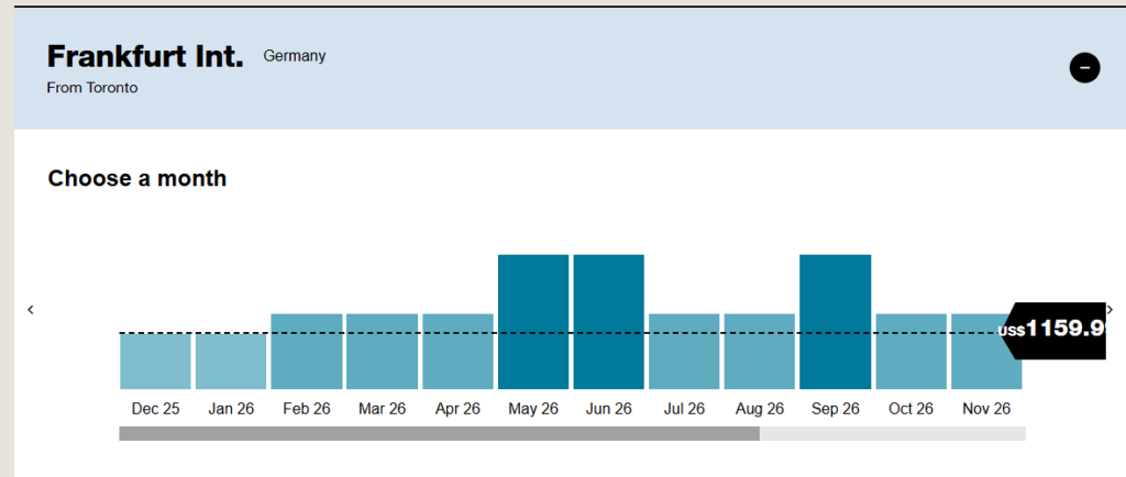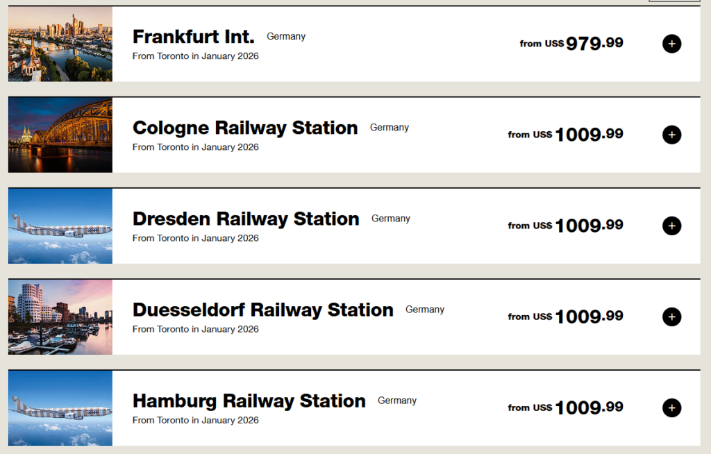 Other European cities are available for similar prices with an additional stop. Within Europe, flights are operated by narrow body aircraft from Frankfurt to the final destination. Flights from North American cities, that have no direct flight connection to Frankfurt, are operated with an additional stop by Westjet.