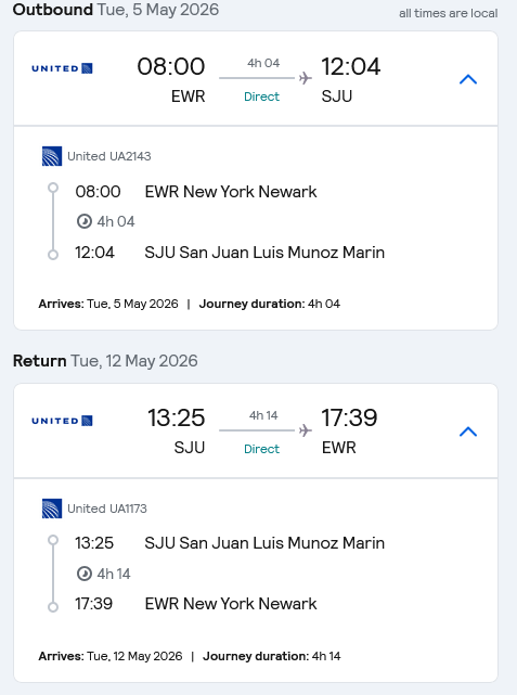 With United Airlines to San Juan in lie flat seats.