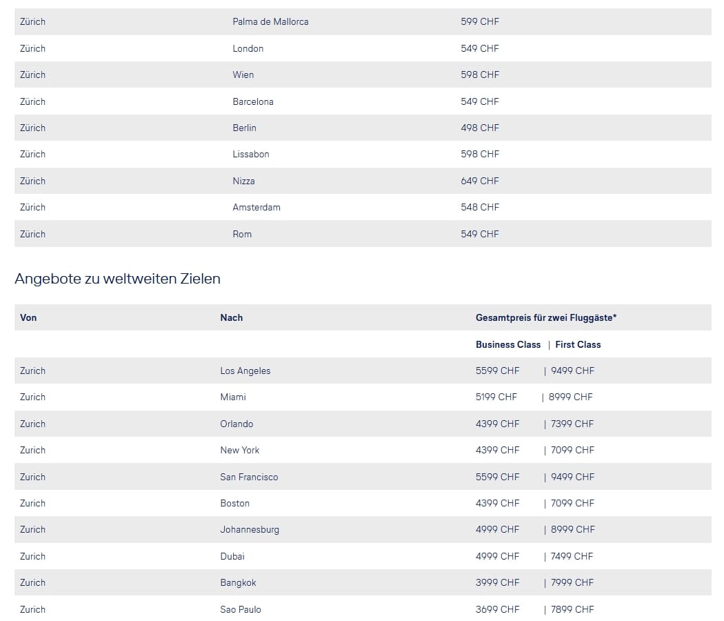 Business/First class Switzerland to worldwide destinations 1850€/3360€