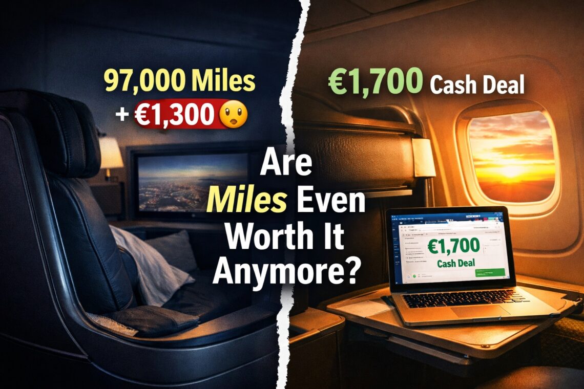 If you compare both options directly, the difference becomes clear. A business class redemption can require close to 100,000 miles plus €1,000 or more in surcharges, often with limited availability and reduced flexibility. A deal, on the other hand, might cost €1,500 to €1,800 in cash, with immediate confirmation and a wide range of available dates.