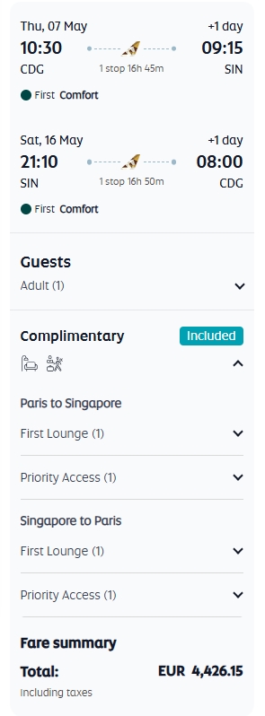 Etihad currently offers an amazing First Class deal from Paris to Singapore for just €4,425 round trip. You’ll experience one of the most exclusive cabins in the sky, featuring a spacious private suite with a separate armchair and bed, fine dining, and Etihad’s signature service, a true First Class experience from start to finish.