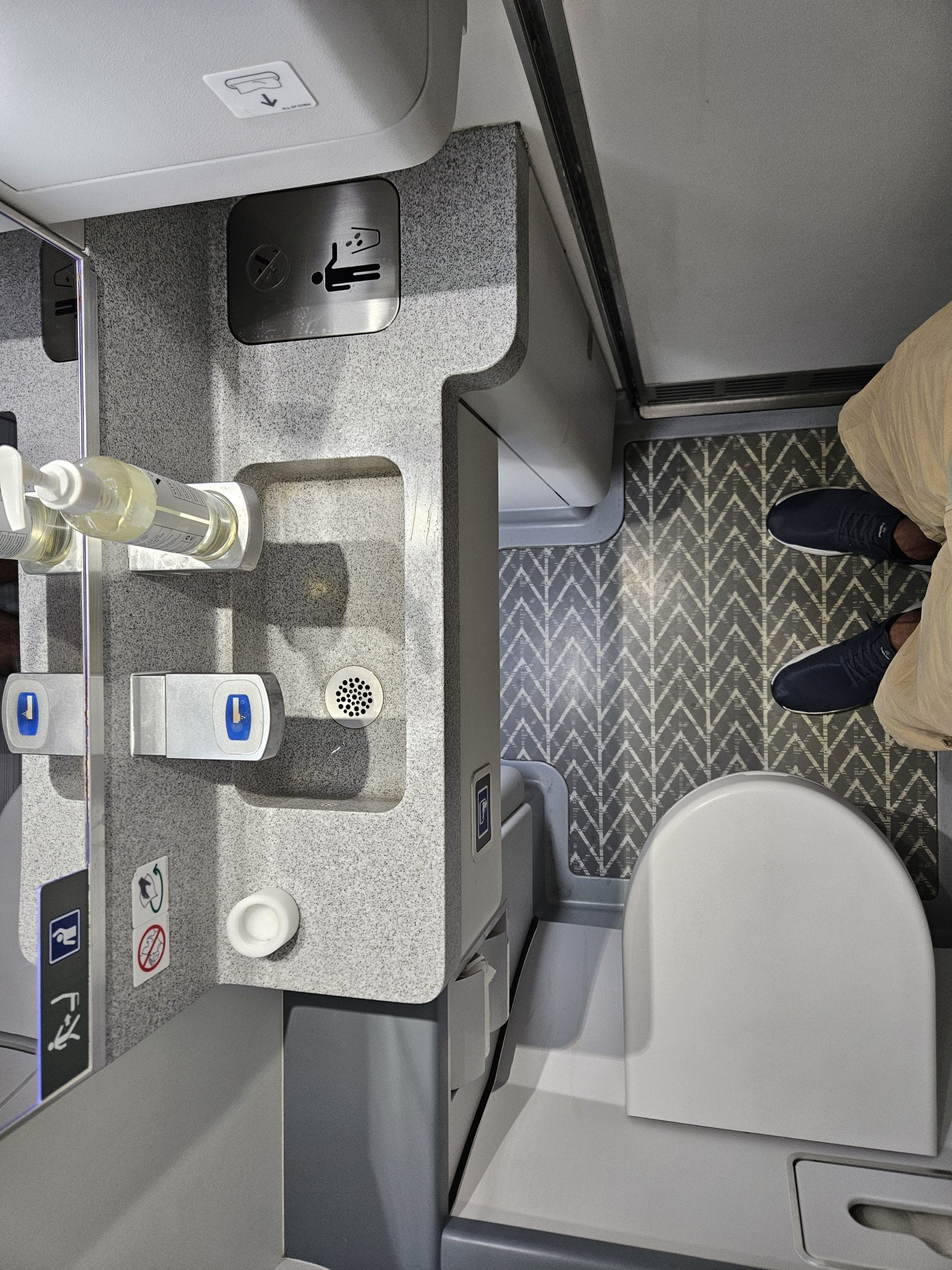 Regarding the restrooms, they follow the typical layout seen on most aircraft, guaranteeing that passengers have access to the amenities they need in a very limited amount of space.