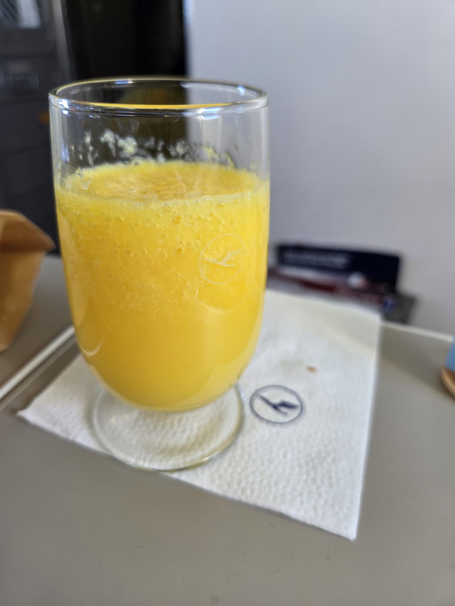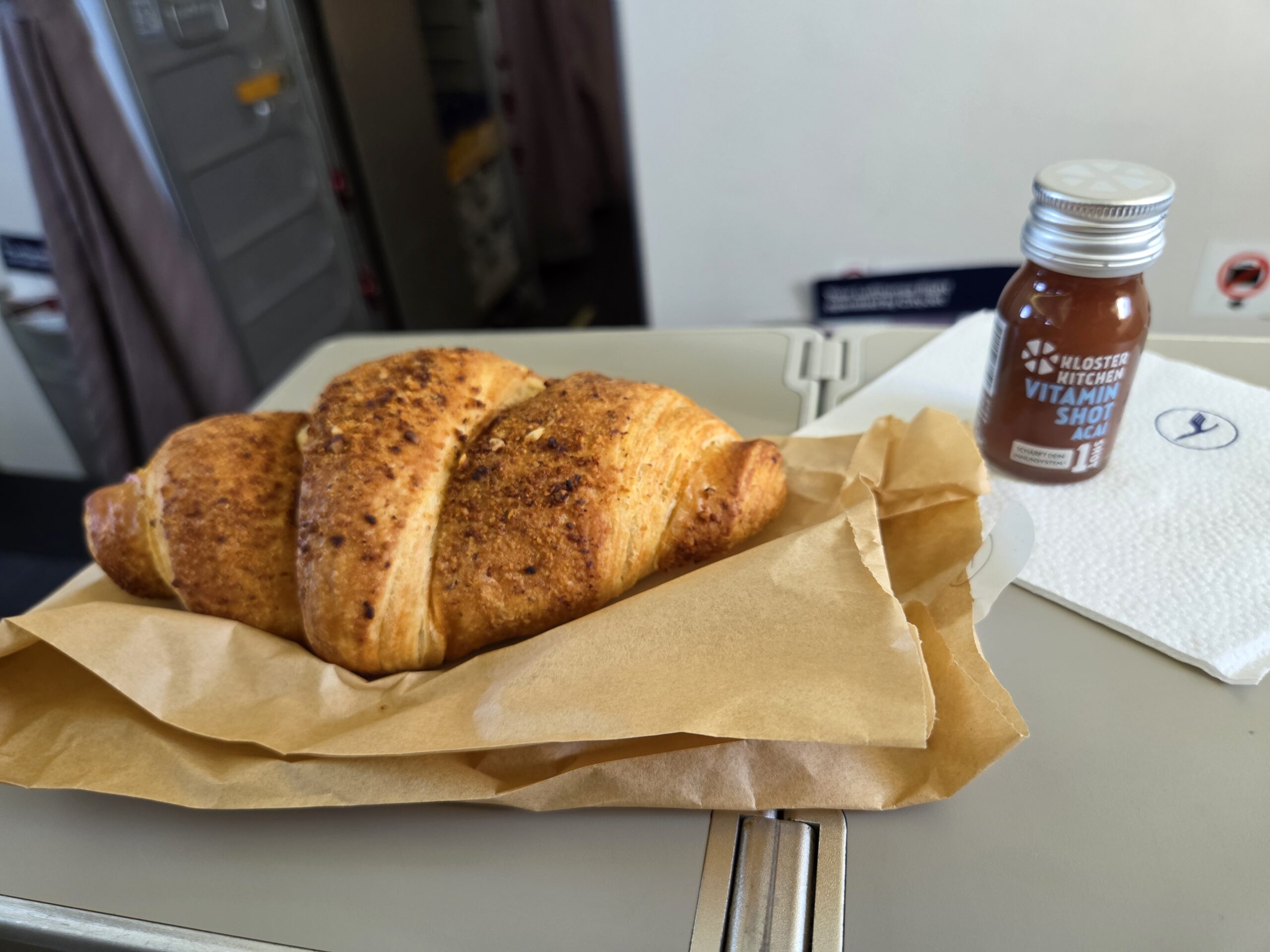 For early morning departures, Lufthansa CityJet provides a light breakfast. On our flight, this included a fresh croissant, a small glass of orange juice, and a healthy shot. While it’s not a gourmet experience, it’s a convenient option for a very short hop between Luxembourg and Frankfurt.