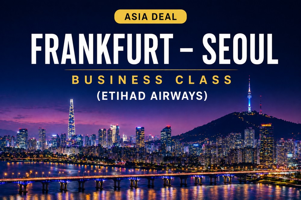 This Business Class deal from Frankfurt to Seoul is operated by Etihad Airways via Abu Dhabi. The airline is known for its modern long-haul fleet and high-quality onboard service, offering a comfortable and reliable travel experience.