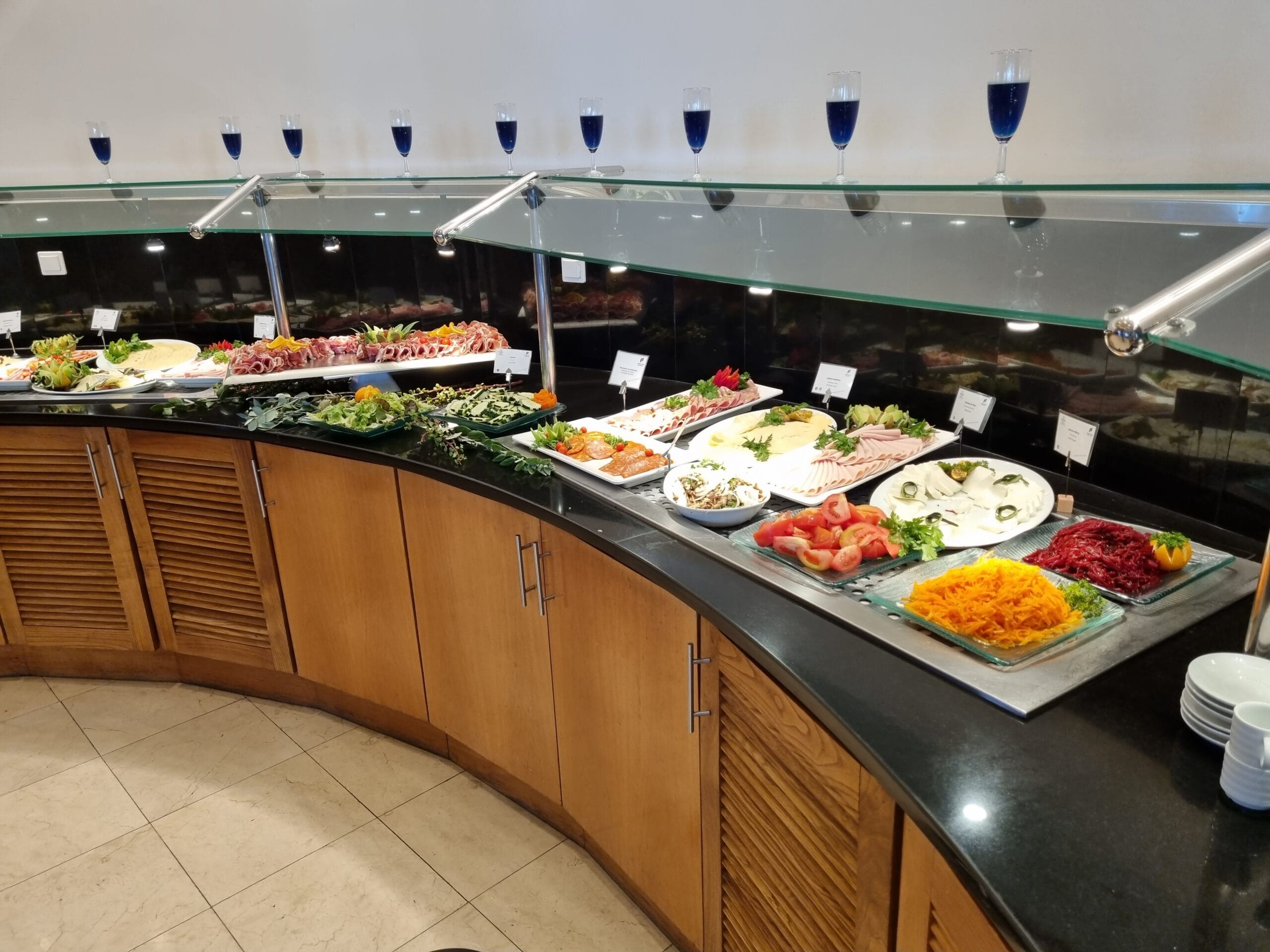 Breakfast was buffet and served at the main restaurant. The choices were very good, from cold to warm dishes and a wide variety of fruits and bread, everything was available. You could also get some egg dishes as well as pancakes at a cooking station.