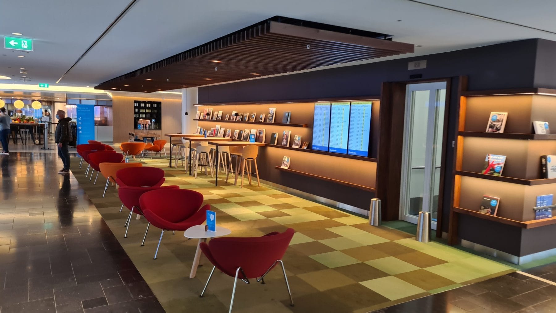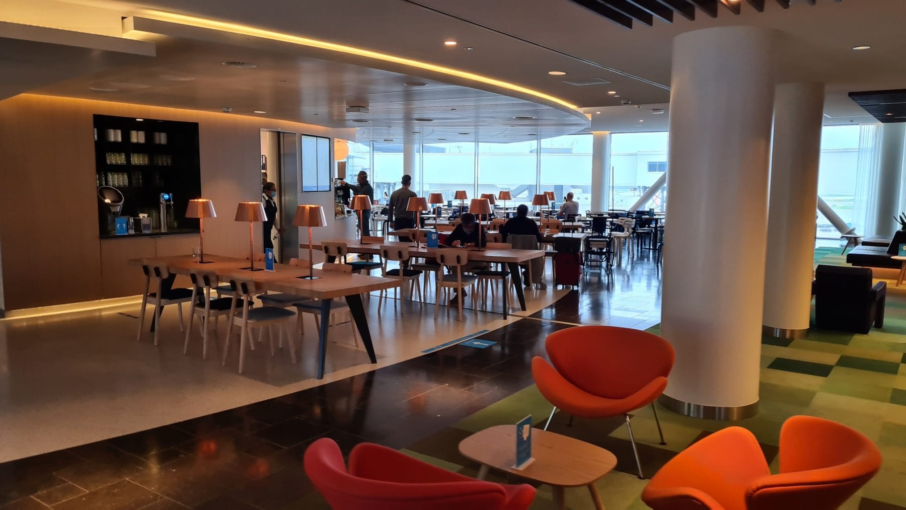 The lounge is split across two levels. On the upper floor a restaurant is located where food and drinks are offered for an additional charge. On the main level complimentary food and drink are served.