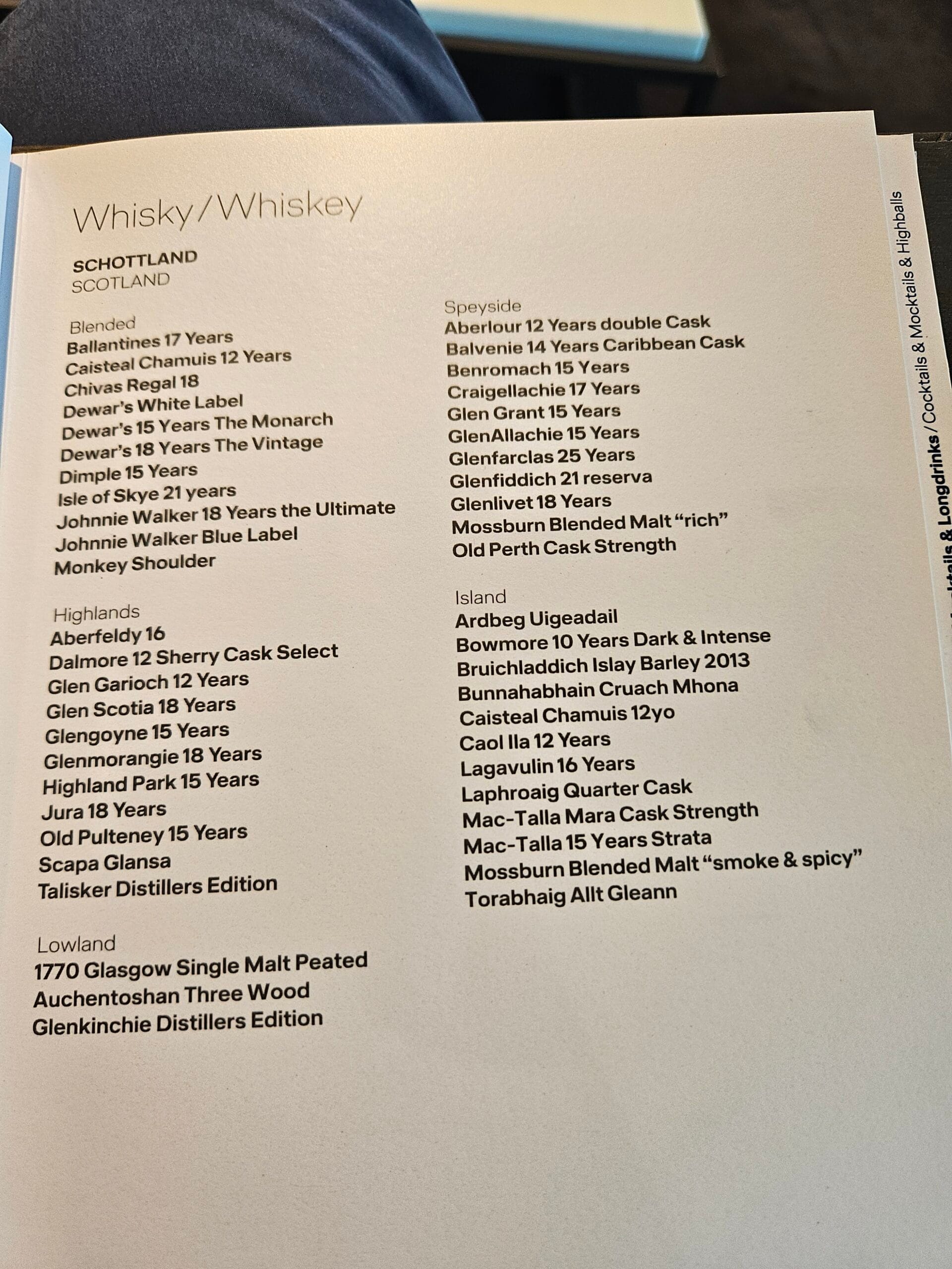 Starting with drinks, the bar boasts an impressive collection of spirits, including an extensive range of whiskies. The skilled bartenders can craft virtually any cocktail you desire. Additionally, there’s a fine selection of premium wines and champagne, alongside a variety of non-alcoholic beverages to suit every taste.
