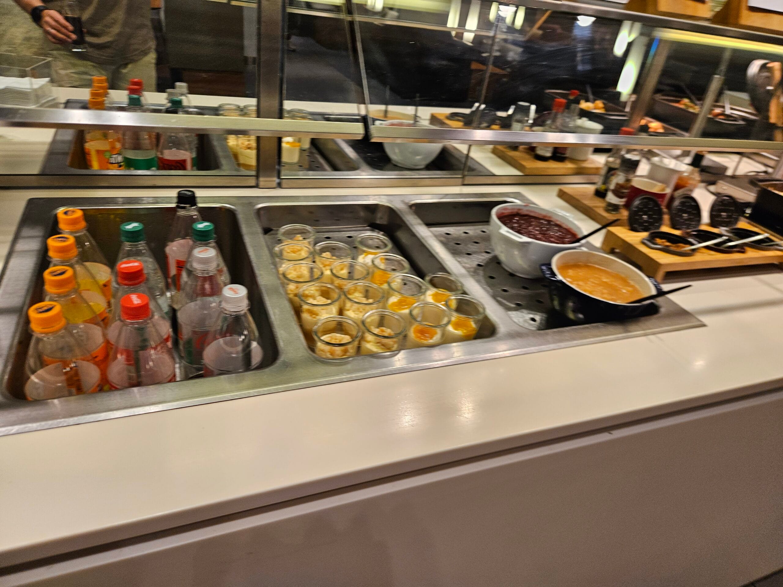 Regarding food, there is a wide selection of cold appetizers and desserts, different options for hot or cold main meals as well as some snacks. Trough the lounge you can find different spots with fresh fruits, freshly made cakes and sweets.