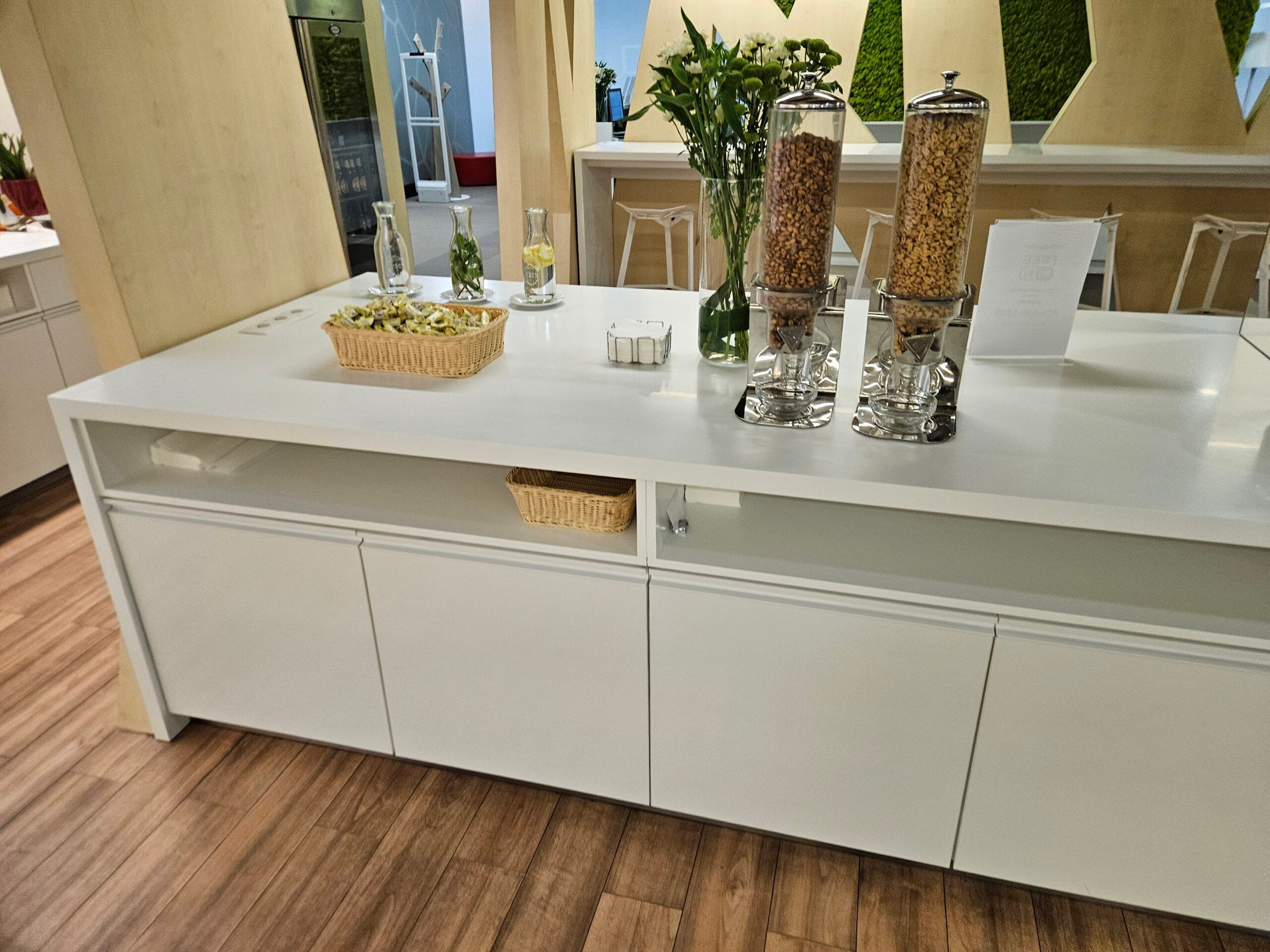 The lounge is mainly one big quadratic room divided by some open dividers. So it is basically an open space design.