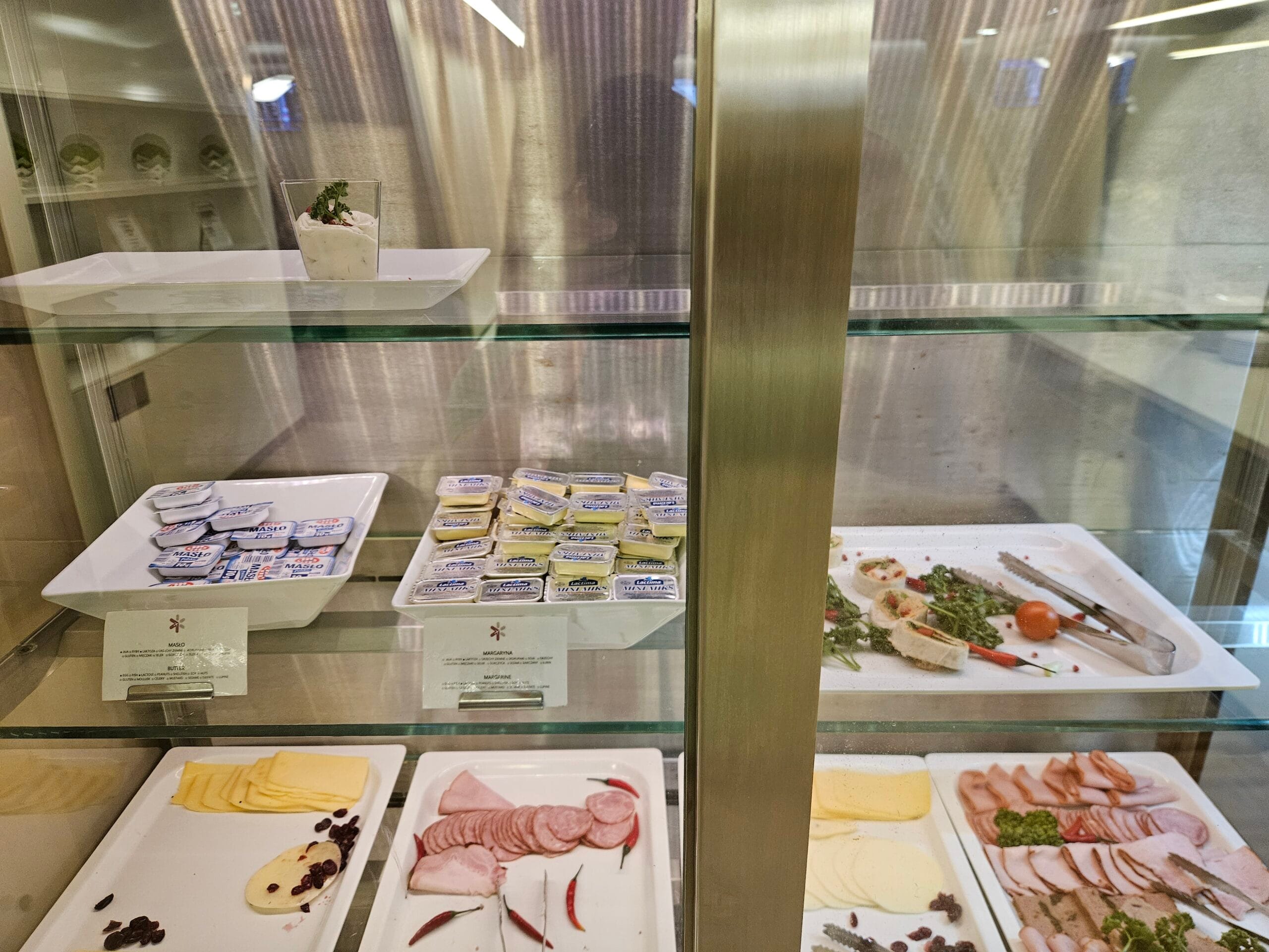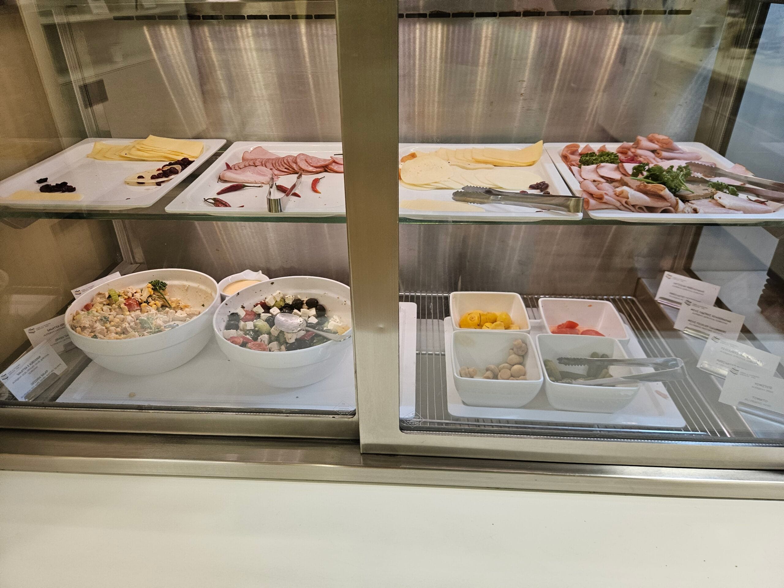 When we visited in the morning, the food options have been below average with mainly cold options like ham and cheese, two kinds of salad, yogurts an some fruits. On top of that you can have some cornflakes. Additionally some snacks like olives and nuts were available.