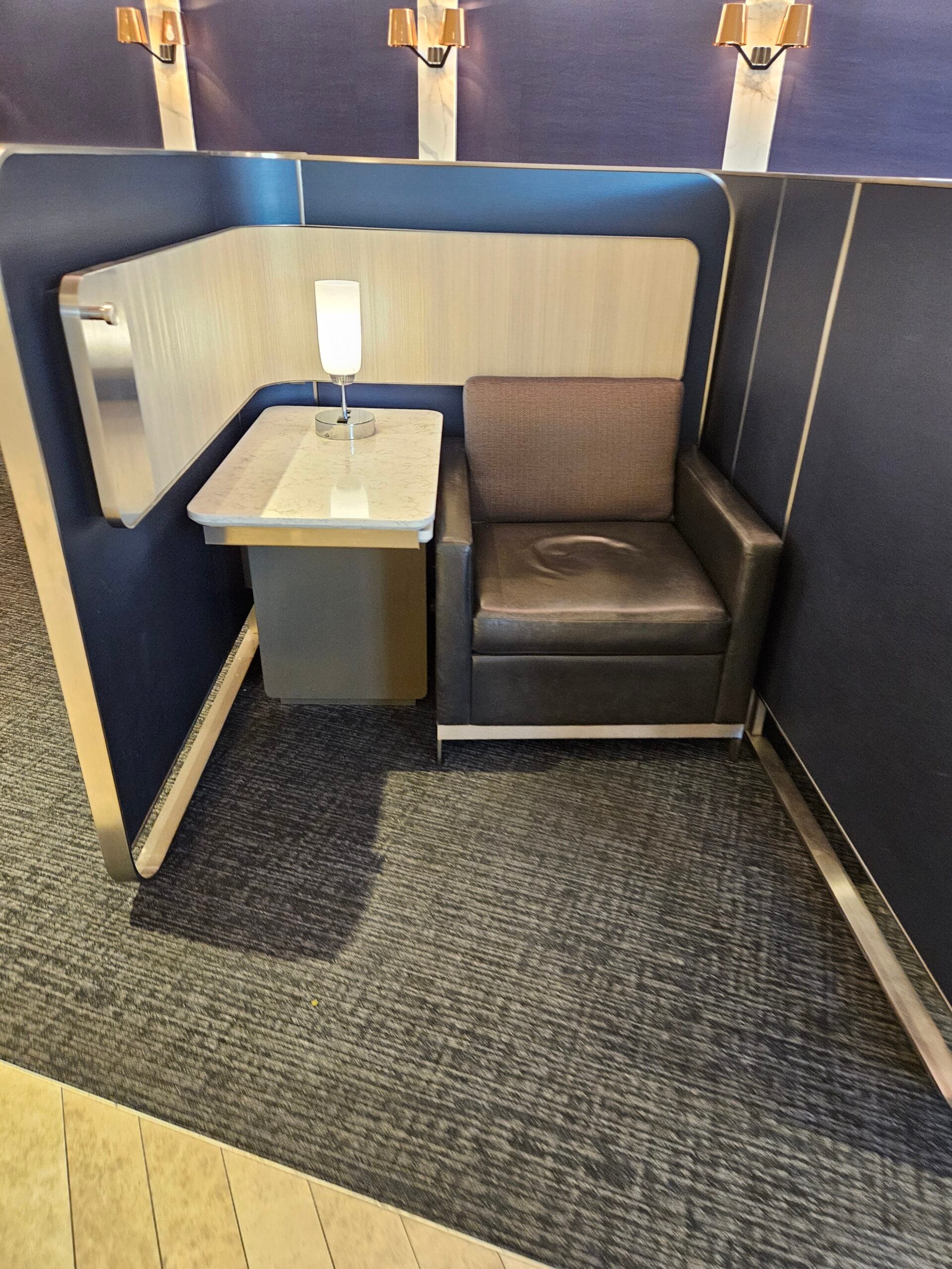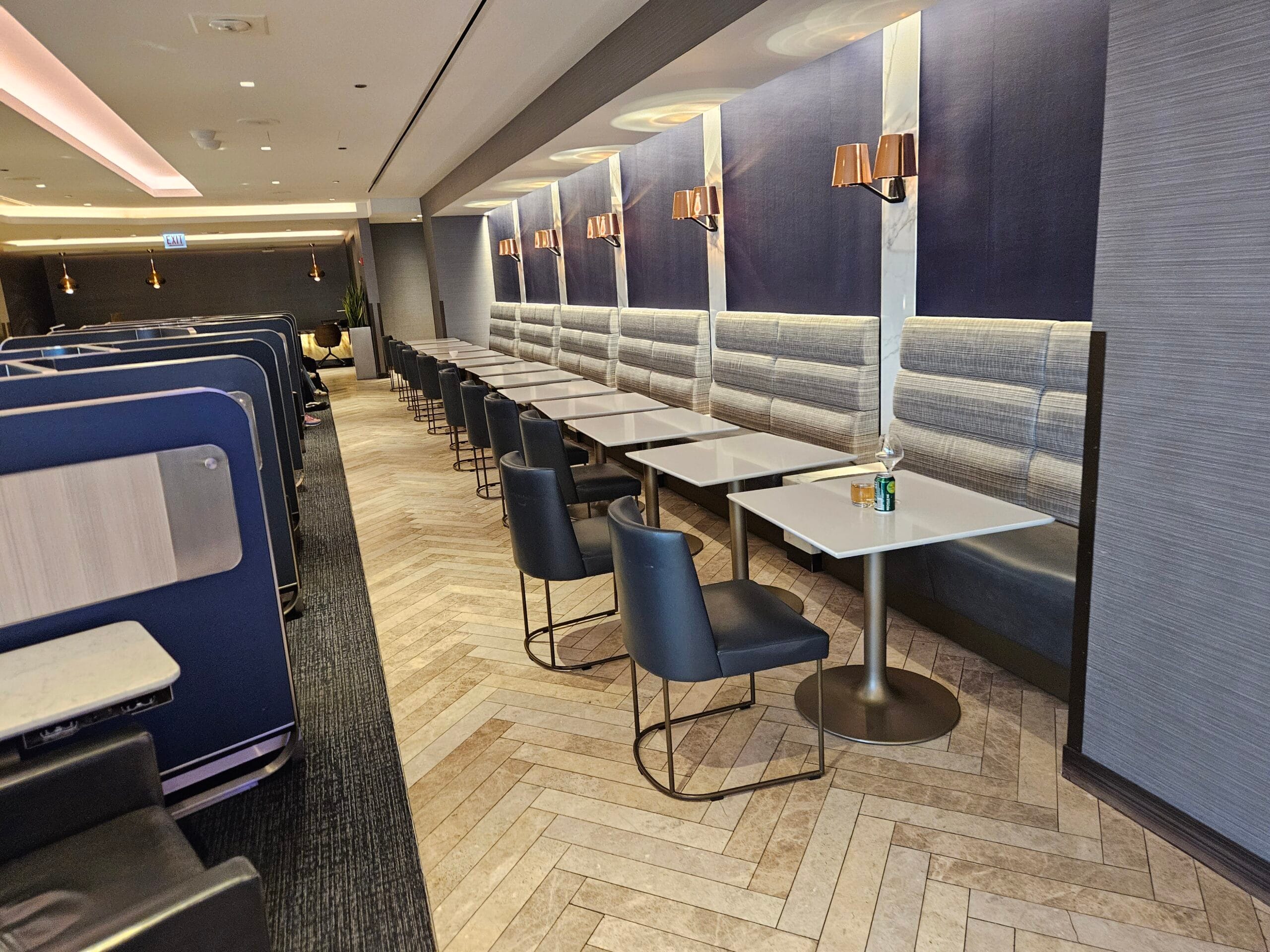 The United Polaris Lounge Chicago offers a variety of seating options for travellers. You have the option between lounge chairs, dining tables, private working booths and bar seating.