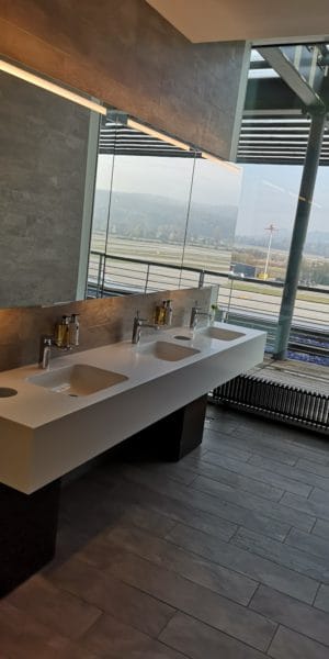 This SWISS Business lounge is located airside upstairs in the Terminal at the E gates, an elevator is also available.