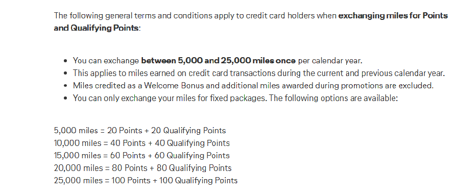 The maximum to earn here is 100 Qualifying Points if you exchange 25’000 miles.
