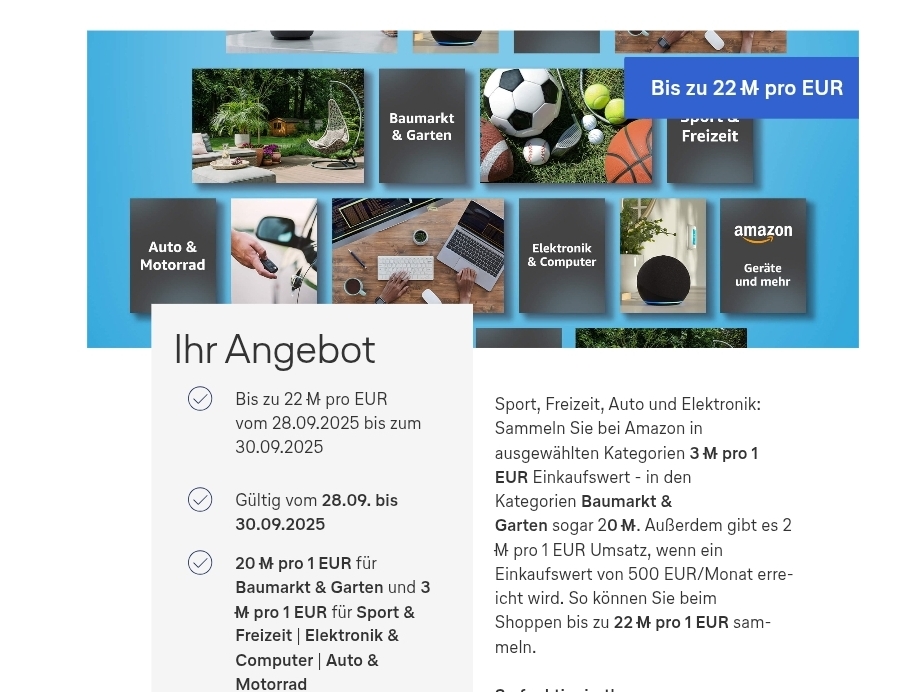For a limited time, when redirecting to Amazon through Miles-and-More, you will earn 20 miles for every euro spent in the Garden and DIY categories. Such a high earning rate has never been available before.