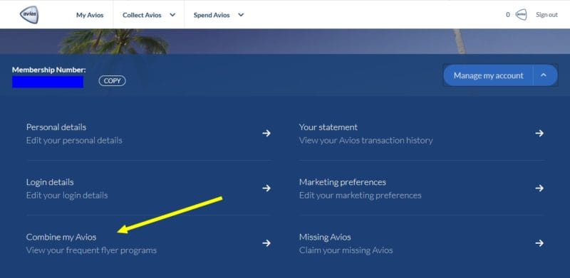 In the next step you have to click again, in your Avios.com account, on manage my account, then Combine my Avios.